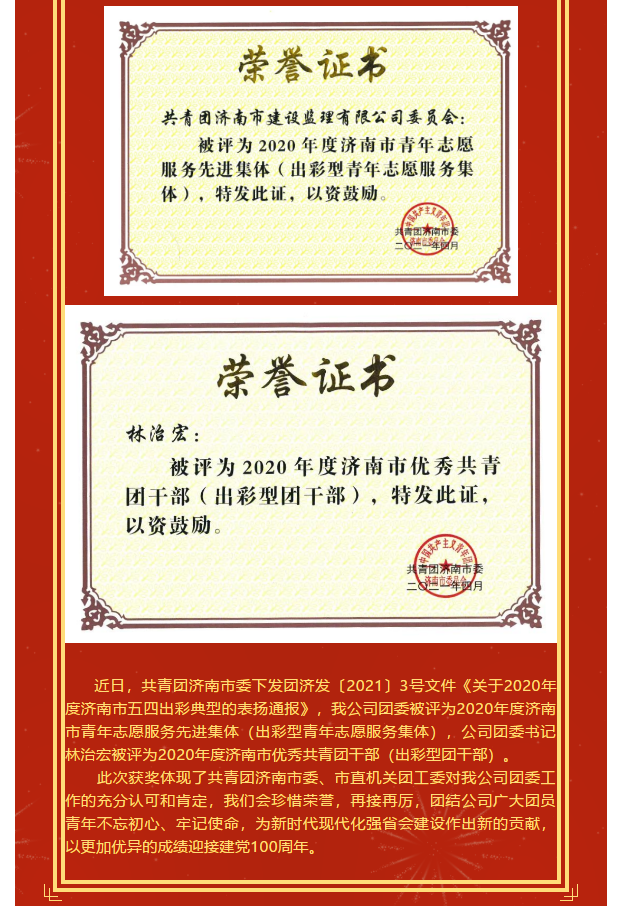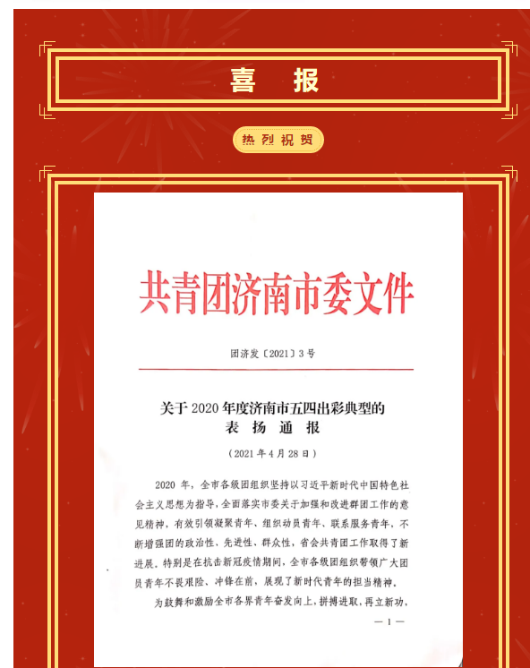 珍惜榮譽(yù) 砥礪前行——公司團(tuán)委在2020年度濟(jì)南市五四出彩典型評(píng)選中榮獲兩項(xiàng)榮譽(yù)